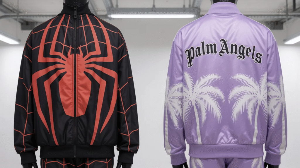 Both styles have a strong presence in the fashion world — Spider tracksuits speak to energetic street culture, while Palm Angels reflect cultured, high‑end streetwear seen on runways and city streets alike.